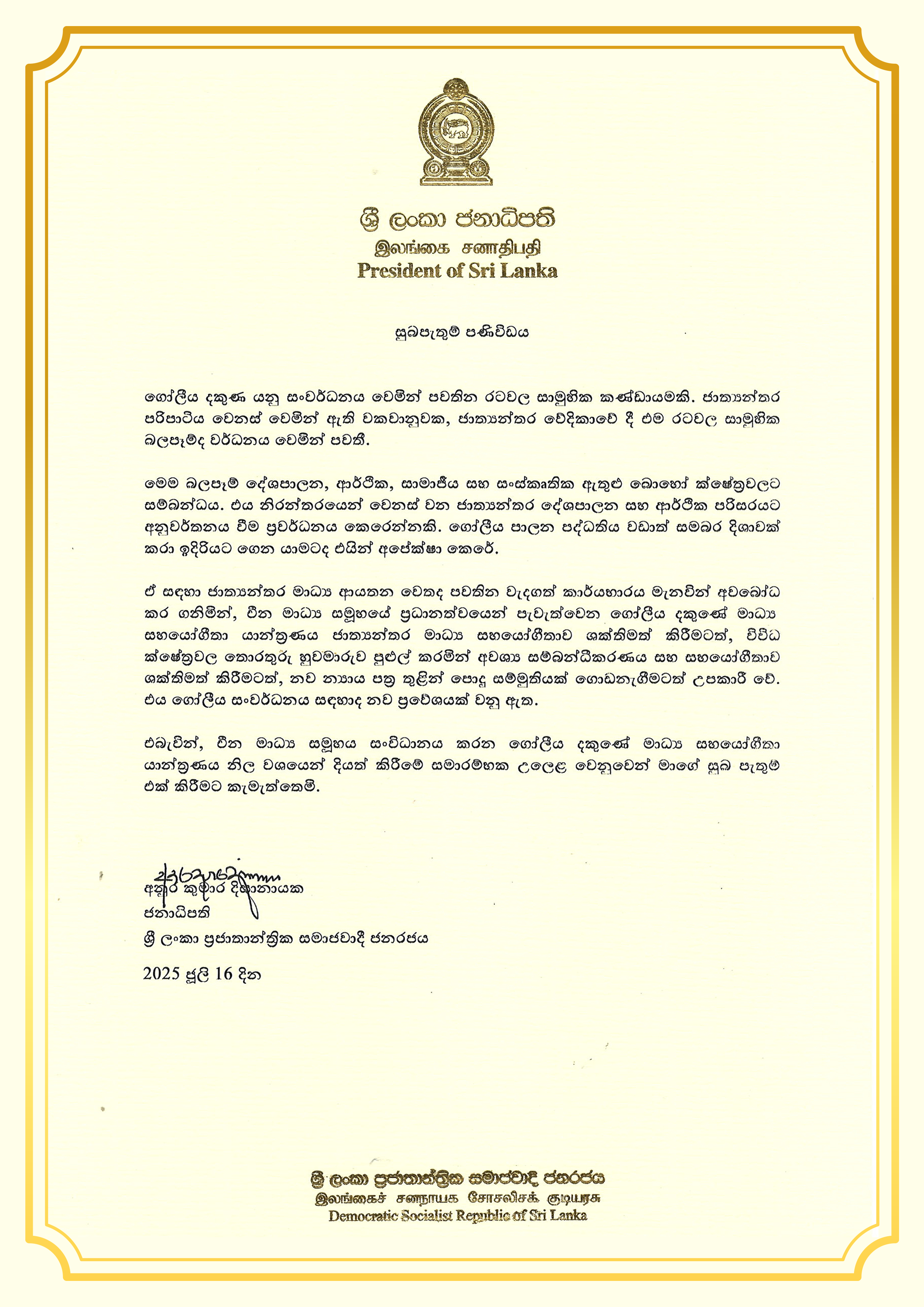 Анура Кумара Диссанаяке в поздравительном письме указал, что по мере глубокой трансформации международной структуры влияние стран Глобального Юга на мировой арене продолжает расти.