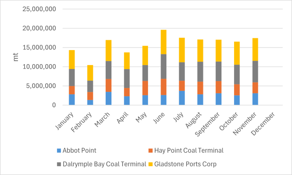 В ноябре этого года экспорт угля из австралийских портов Хей-Пойнт, угольного терминала Далримпл-Бэй (DBCT), Эббот-Пойнт и Гладстон, расположенных в штате Квинсленд, снизился на 1,4 процента в годовом исчислении и увеличился на 5,9 процента в месячном исчислении до 17,44 миллиона тонн, согласно данным, опубликованным North Queensland Bulk Ports Corporation и Gladstone Ports Corporation.