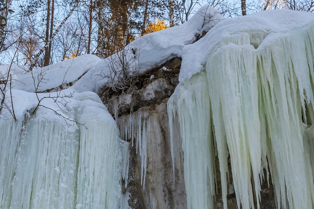 Абзановский водопад зимой превращается в ледяную фату. Летом это легкая капель, падающая со скалы. Водопад находится на правом берегу реки Инзер.